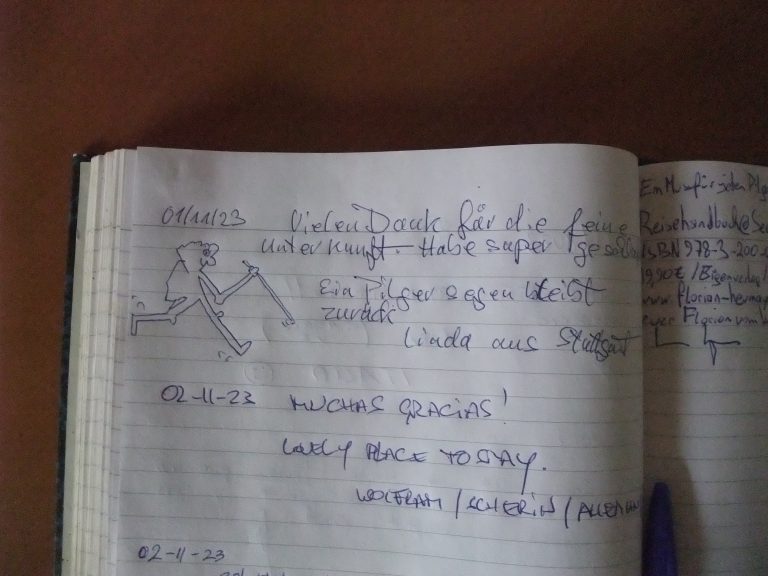 Es ist erst Etappe 5, aber ich fühle mich schon seit Wochen unterwegs. Wenn das so weitergeht, brauche ich ja gefühlt Monate bis ich ankomme. Also, da ich gestern Pause gemacht habe und den Tag davor schon 12km gelaufen bin, will ich heute nicht nochmal 12km laufen. Ich entscheide ich mich die 46km Etappe auf mich zu nehmen und nach 27km zu trampen, wenn ich wieder die Bundesstraße erreiche. In der Hoffnung jemand nimmt mich mit, sonst schlafe ich heute draußen. Deswegen heute 07.25 los. Grad so die ersten Pfeile erkennbar. Ich begegne erst einem Hirten (was ein verschickter Beruf) und dann erreiche ich die Stadt „Casar de Caceres“, in der es den besten Käse der Welt geben soll. Keine Zeit zum Naschen – Ich will laufen. Ich durchquere die Stadt und erreiche eine extrem schöne Hochebene. Der Weg führt Kilometerweise gerade aus. 30 Minuten lang sehe ich jedoch aber dem Weg keine Pfeile mehr. 40 Minuten nichts. 50 Minuten nichts. Ich fange an mich unwohl zu fühlen und unruhig zu werden. Heute darf ich mich nicht verlaufen. Nicht wenn ich unter Zeitdruck stehe, weil ich ja trampen möchte bevor es dunkel wird. Ich laufe einfach stur weiter. Immer noch kein Pfeil. Ich treffe einen Bauern. Dieser sagt: „Gerade aus!“. Ich habe das Gefühl der hat mir nicht Mal zugehört. Ich bin sauer. Ich habe in dem Pilgerbuch von Hape Kerkeling gelesen, wenn man 20 Minuten keinen Pfeil sieht ist man falsch. Ich, nach 55 Minuten, raste fast aus. Nach gefühlten 2-3 Kilometern sehe ich dann wieder einen Pfeil. Ekstase wie mit Basti in Berlin feiern. Mittags erreiche ich die Bundesstraße und fange an zu trampen. Wieder der nächste Struggle (Bisschen viele für meinen Geschmack auf dem Jakobsweg). Ich male mir schon aus wie ich heute draußen penne. Ich lege meinen Rucksack ab, strecke den Daumen raus, sehe das erste Auto anfahren und zack vorbei. Hmmmm. Doch dann drehe ich mich um und sehe es hält und hat den Warnblinker an. Ich renne so schnell wie möglich zu den Auto. Es bringt mich bis zur Herberge.