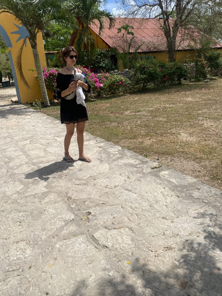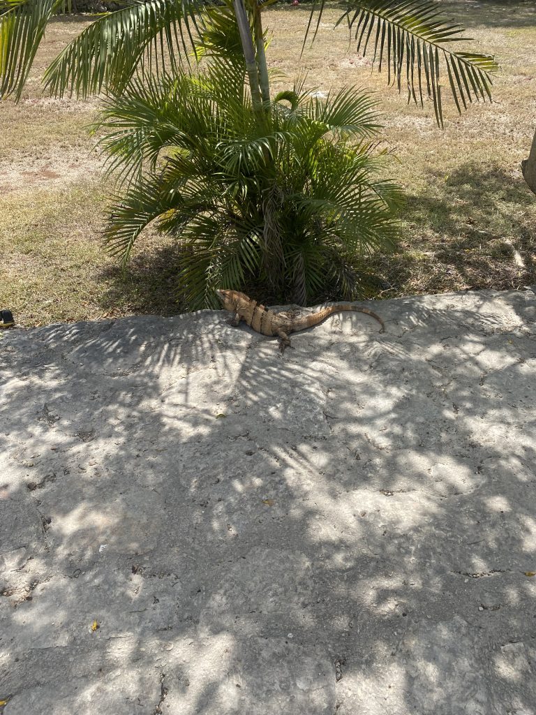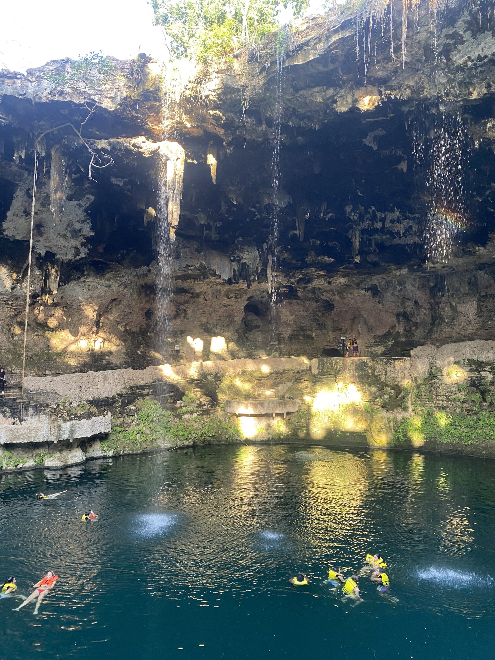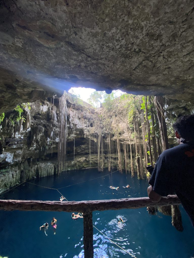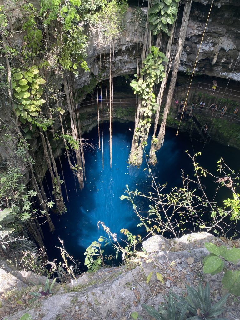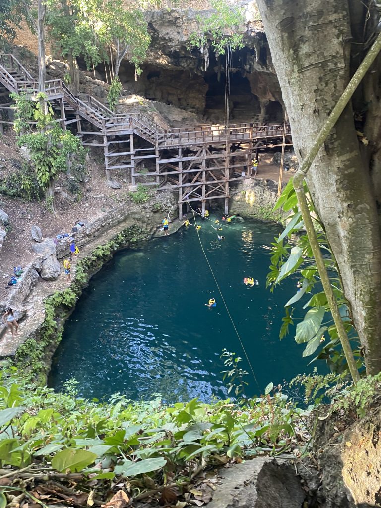 Heute waren wir in der Cenote „Oxman“. Wir sind mit einem Taxi hingefahren und haben 6€ für die Fahrt gezahlt. Dort konnten wir uns mit einem Seil in die Cenote schwingen. Ich habe versucht einen Rückwartssalto zu machen und bin auf den Rücken gefallen.